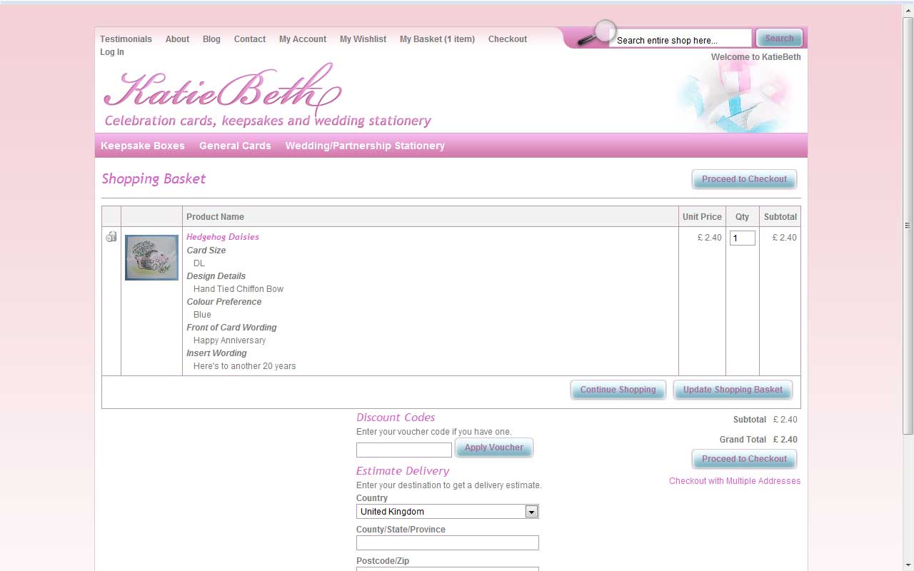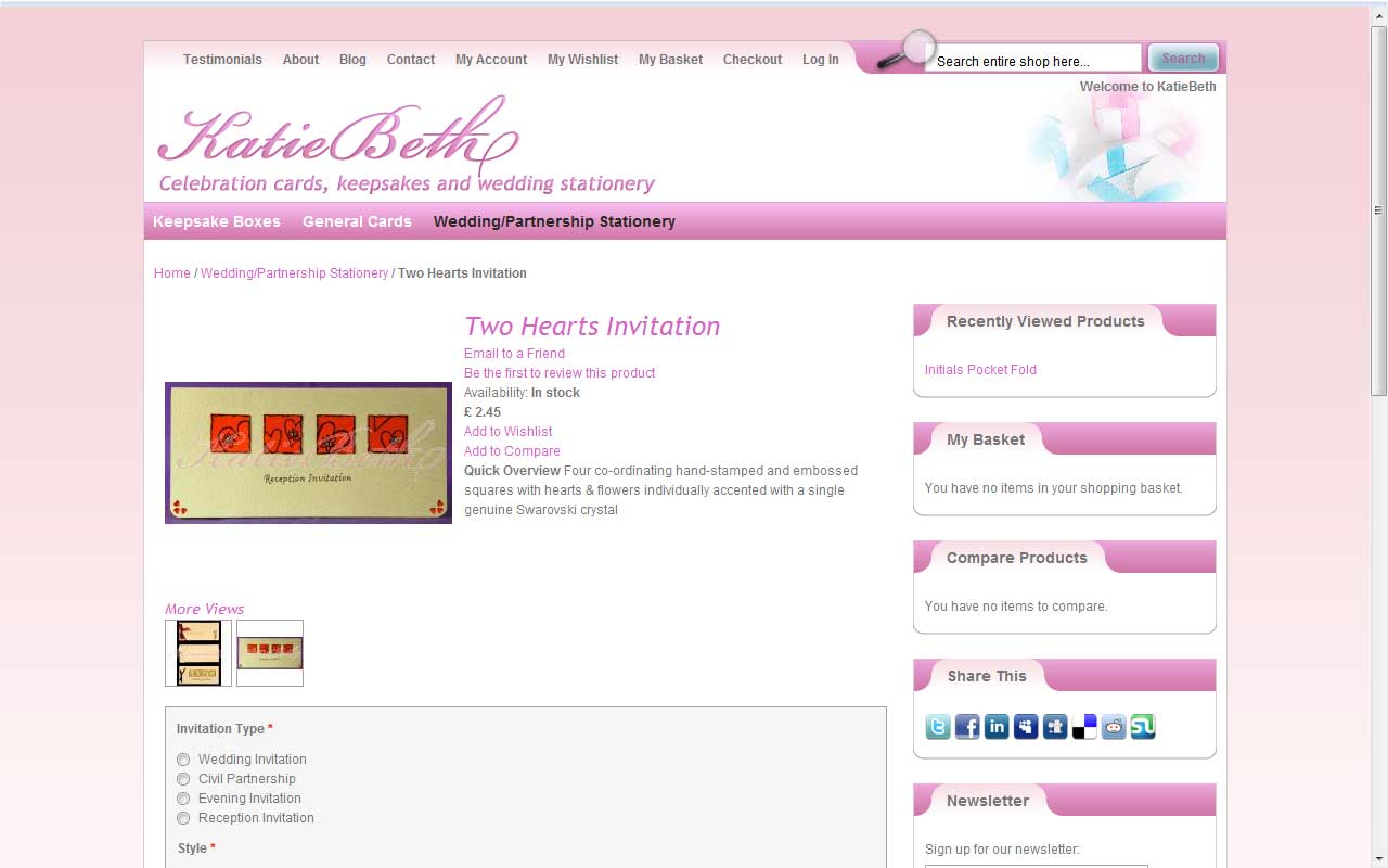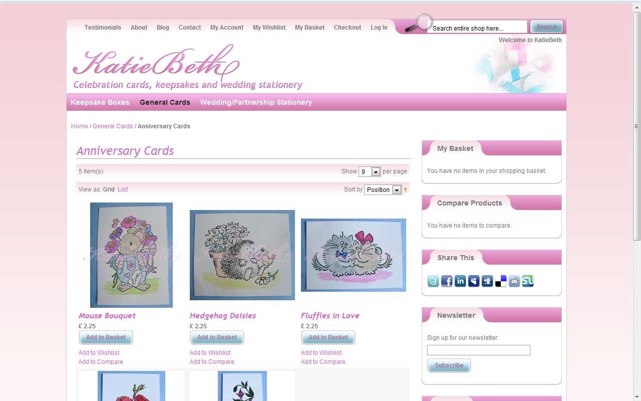 Katiebeth Cards Design and development for a wedding/greetings card supplier Continue reading… Responsible For: CSS, Design, HTML, Magento I designed and developed a Magento theme for Katiebeth Cards.